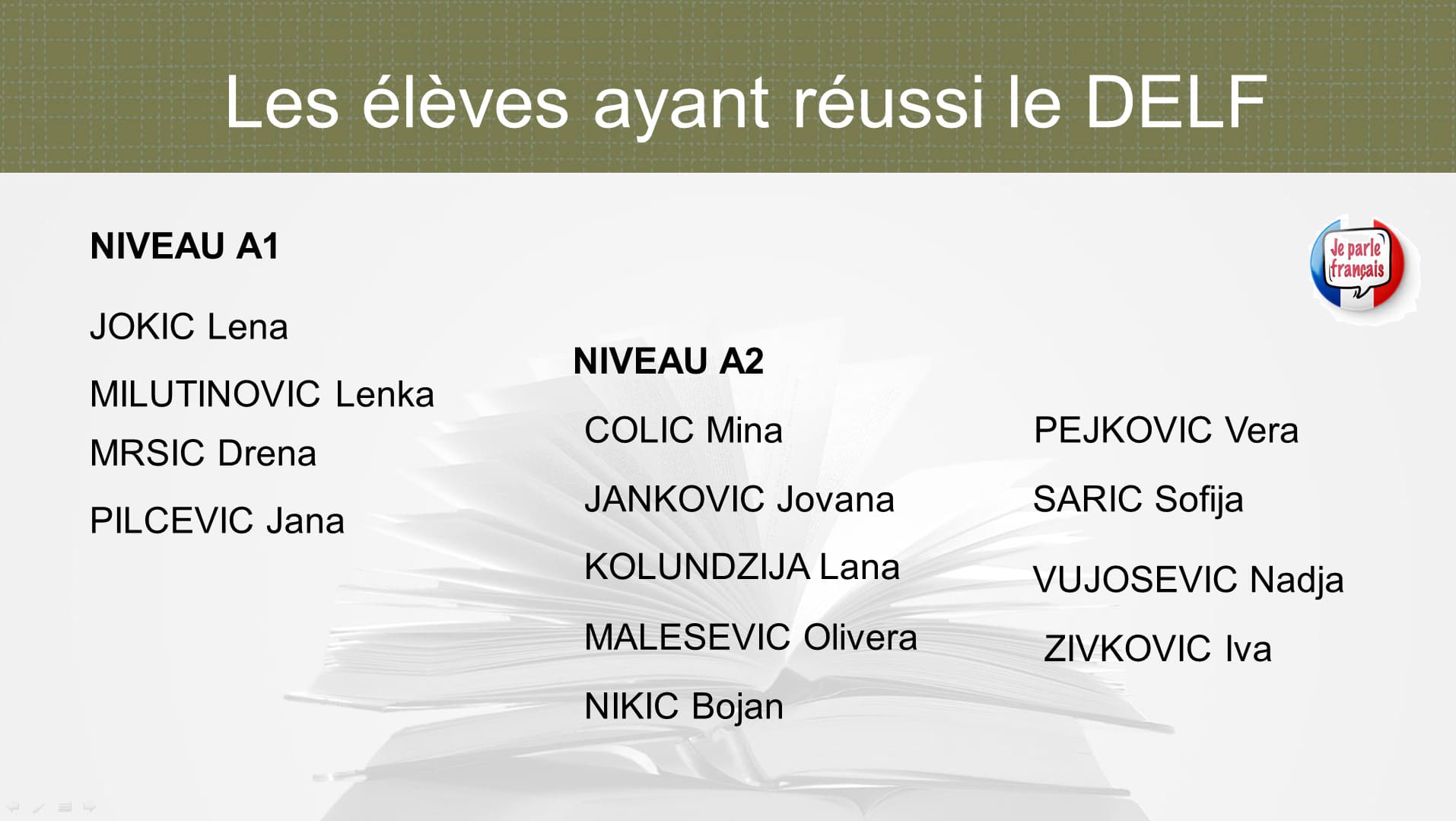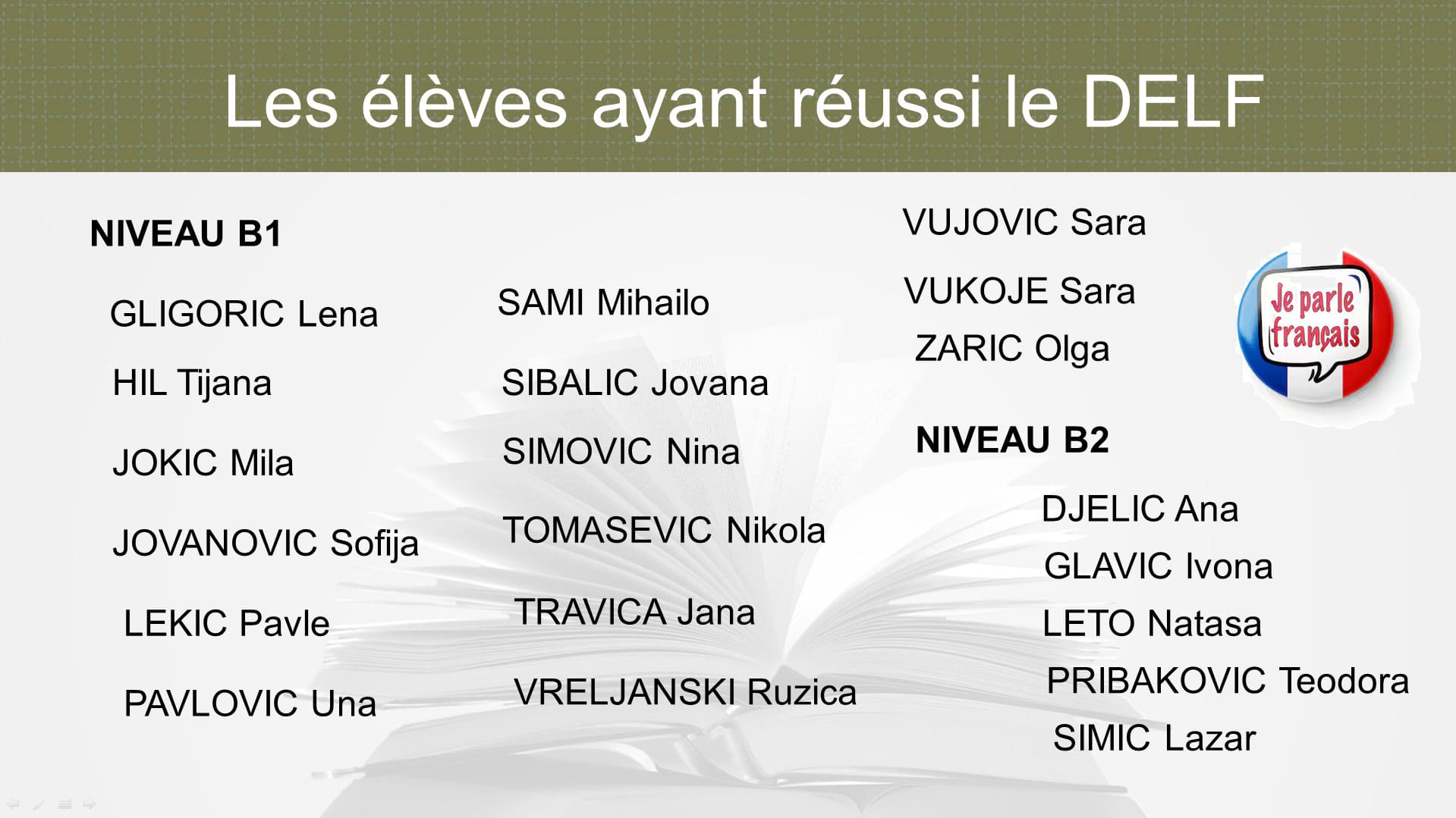 Током школске 2024/25. године, укупно 33 ученика наше школе успешно је положило испит и стекло међународно признате DELF дипломе, чиме су показали висок ниво знања француског језика.
